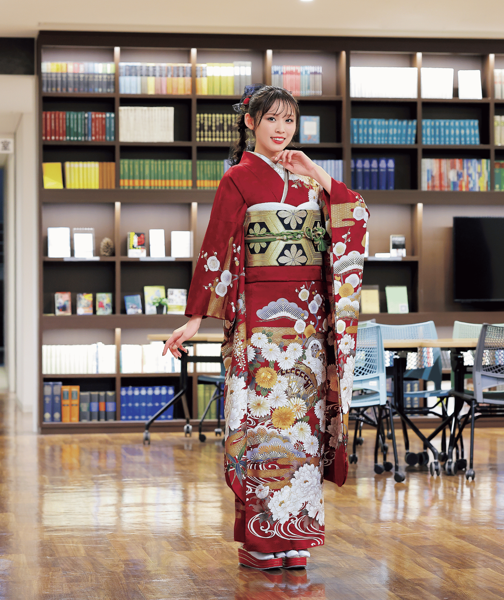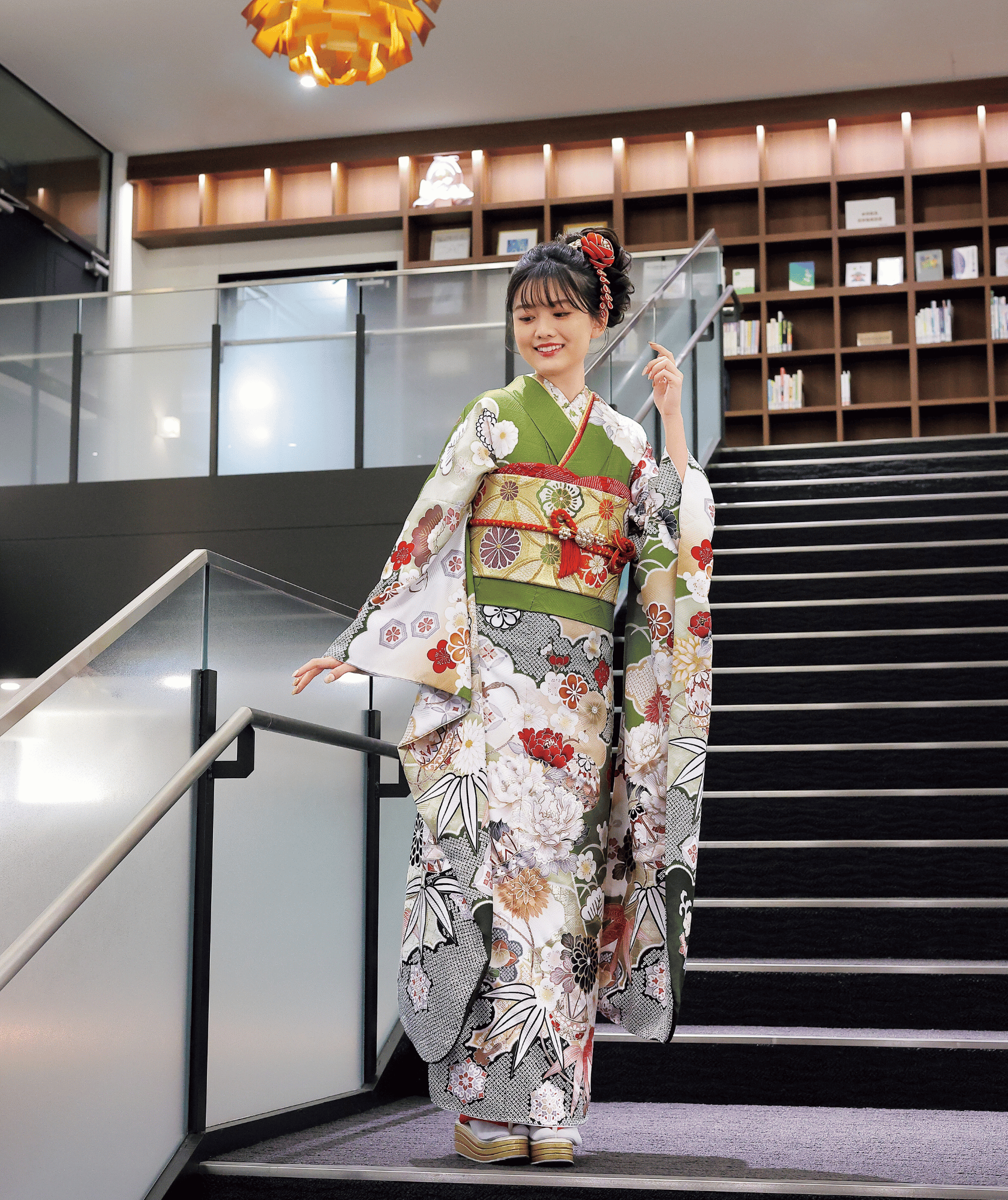 ヘアはタイトなシニヨンや、スッキリしたアップスタイルで「面」の美しさを見せると、振袖の豪華さが際立ちます。