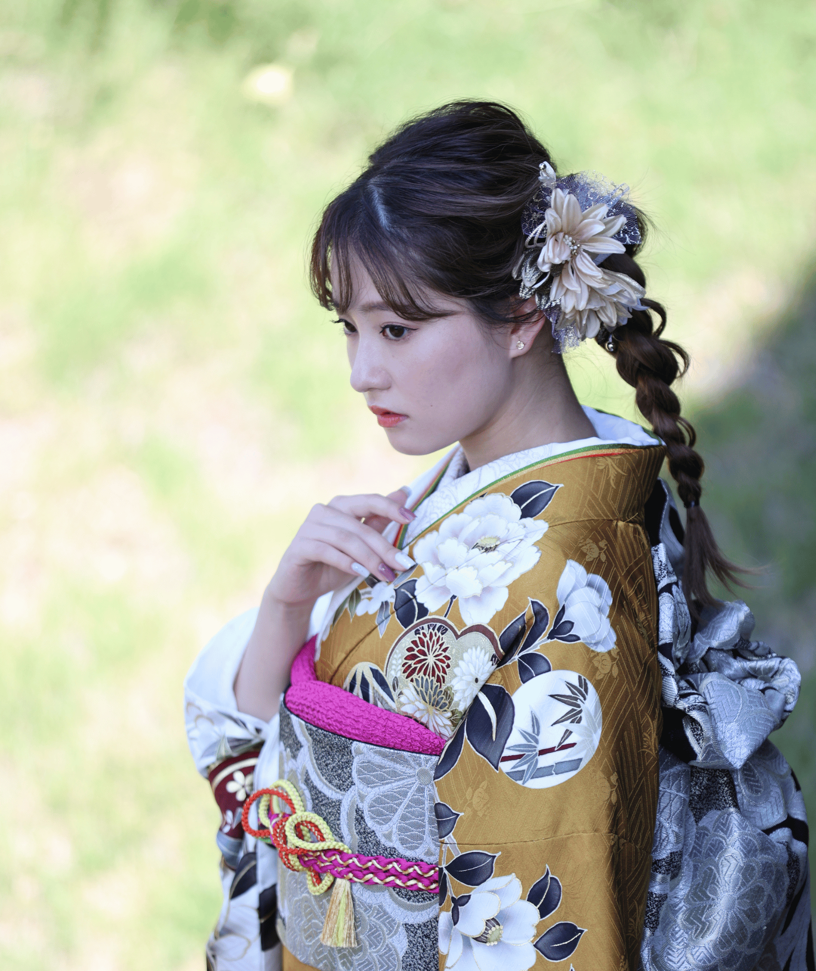 編み下ろされた髪は、その豪華な帯に向かって視線を誘導するような役割を果たしてくれます。